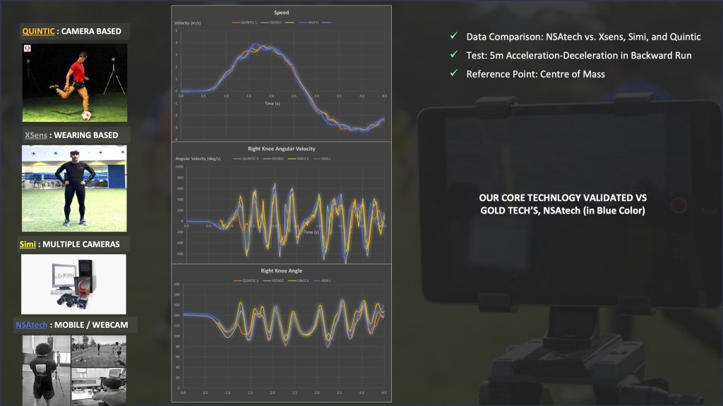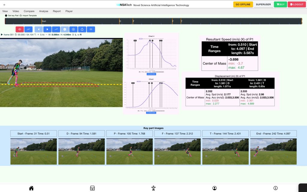NSAtech allows you to Generate useful information such as charts, and XYZ coordinates in ways of Manual floor Calibration, by clicking 4 points from left to right on cons or targets that are placed in the user video and get access to useful values such as Displacement (m), angles (deg), Angular velocity (deg/s), Speed (m/s), Acceleration (m/s2) in charts and tables.